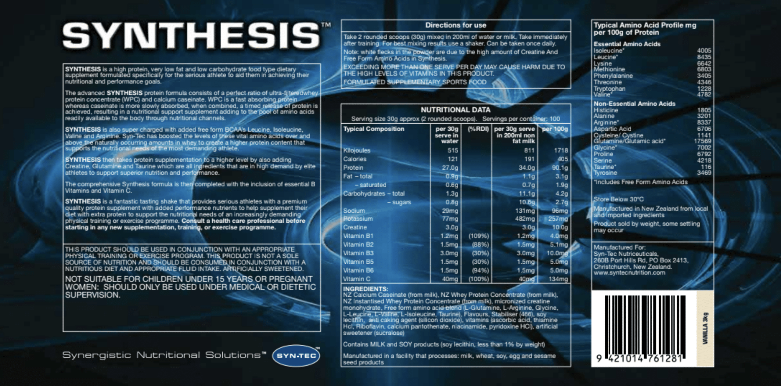 Syn-Tec Synthesis is a high-protein, low-fat, low-carbohydrate dietary supplement designed for serious athletes and active individuals seeking to support muscle recovery, strength, and daily protein intake.